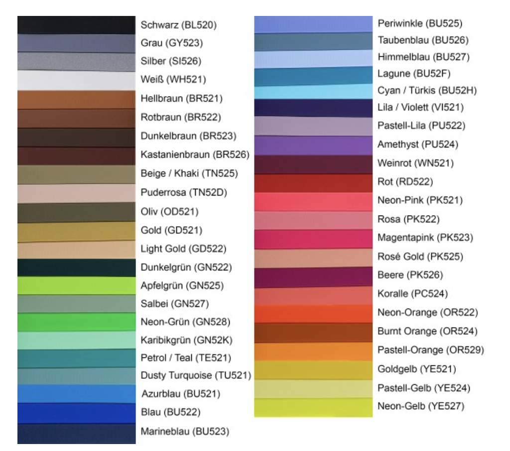 Hier kannst du dir schon mal einen kleinen Überblick über die vielen verschiedenen Farben verschaffen. Am besten überlegst du dir bis zu unserem Termin 1-3 Farben die du gerne in deinem neuen Maulkorb sehen würdest..
